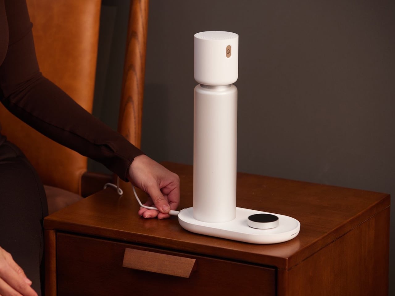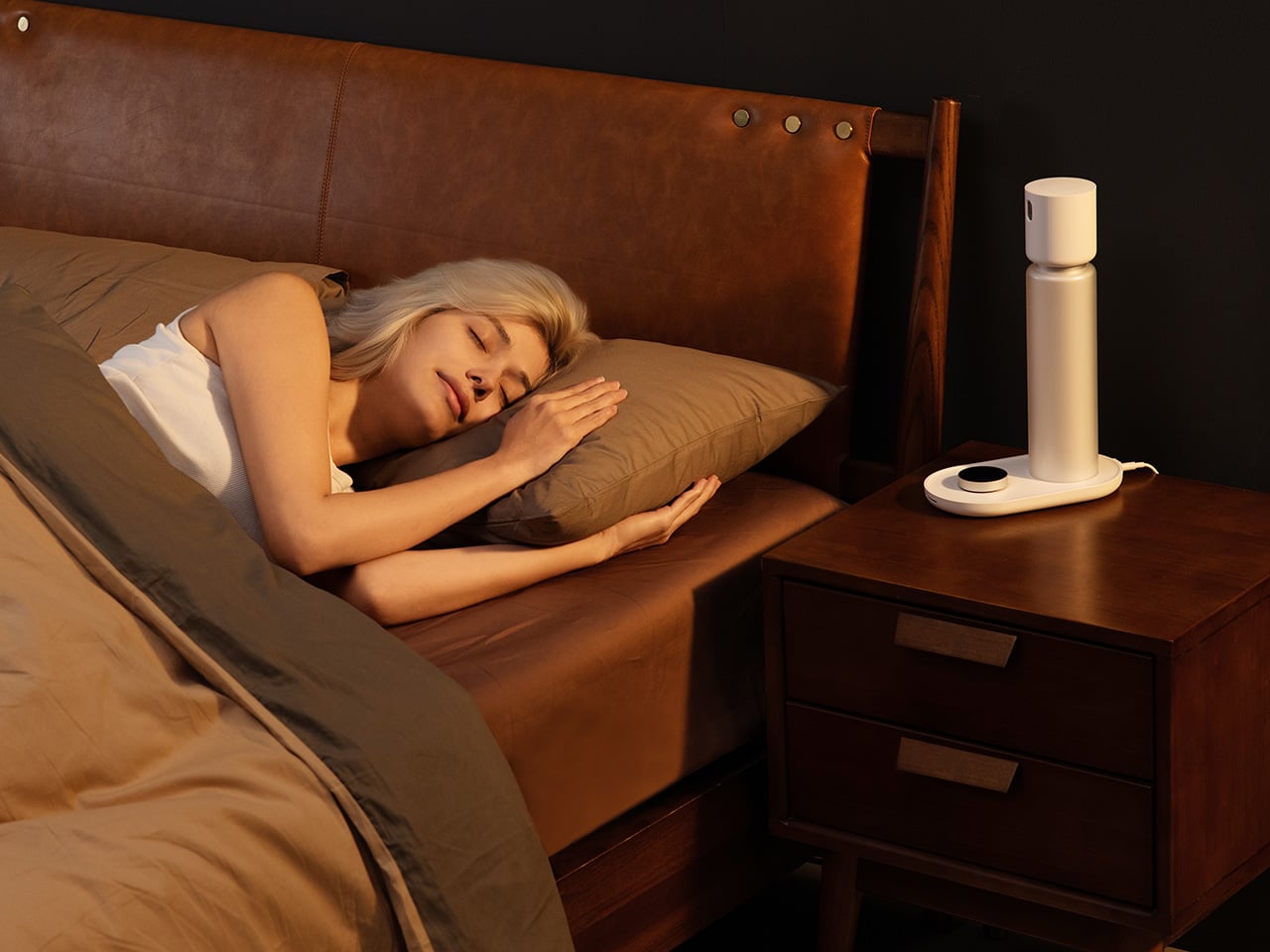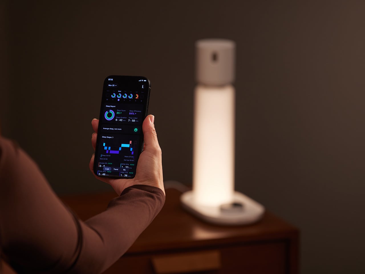Because it functions as a lamp, the light itself becomes part of how it supports your sleep. It adapts through the night, softening as you settle in and brightening gently as morning approaches. Plus, it reads the room’s environmental conditions, capturing the ambient factors that affect rest and giving you a fuller picture of your night by combining physiological and environmental data.