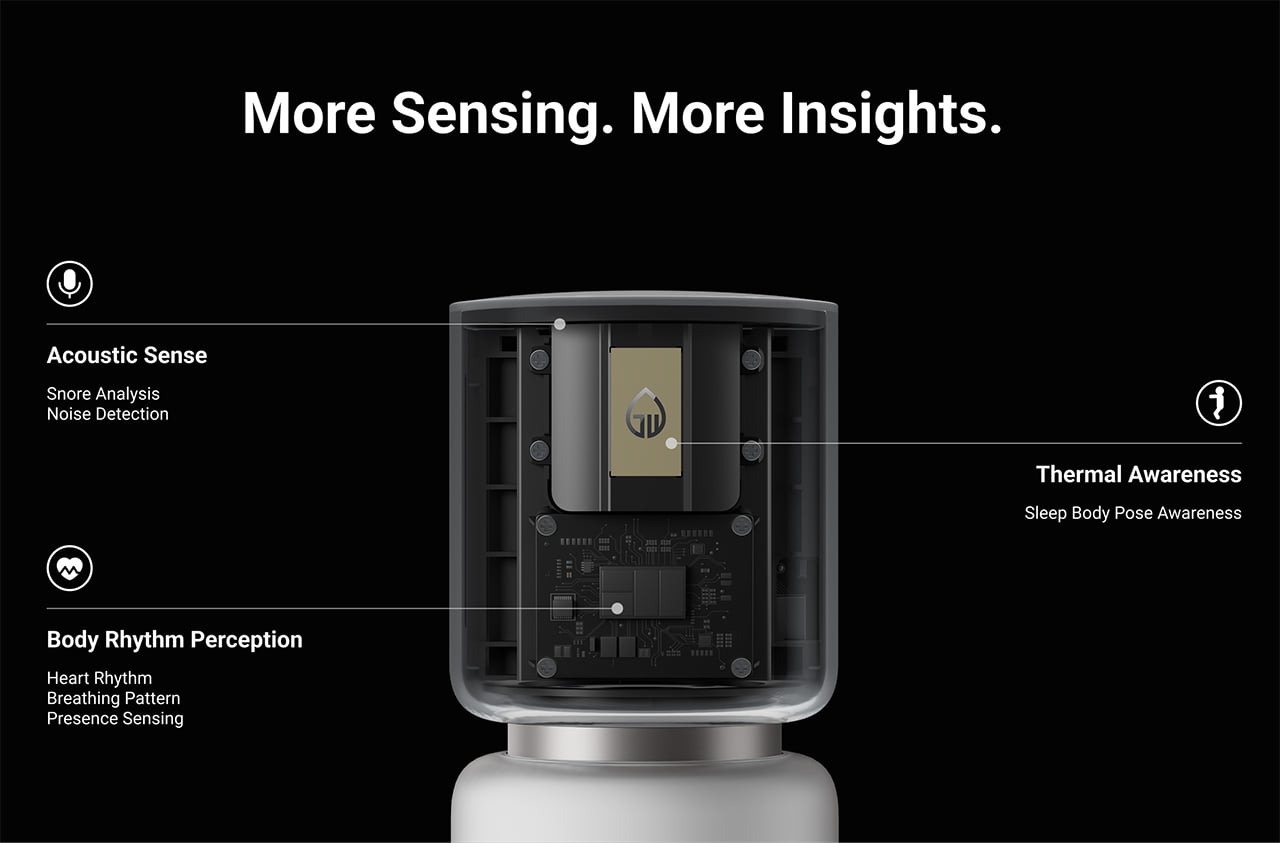 Behind that calm, unhurried exterior sits some serious sensing technology. Sleepal uses 60 GHz millimeter-wave radar with a detection precision of 0.1 mm, picking up the subtle chest micro-movements that come with breathing and a heartbeat. Those signals combine with environmental data and run through a sleep AI model built from scratch with nearly 100 million parameters, making the sleep-stage picture both thorough and precise.