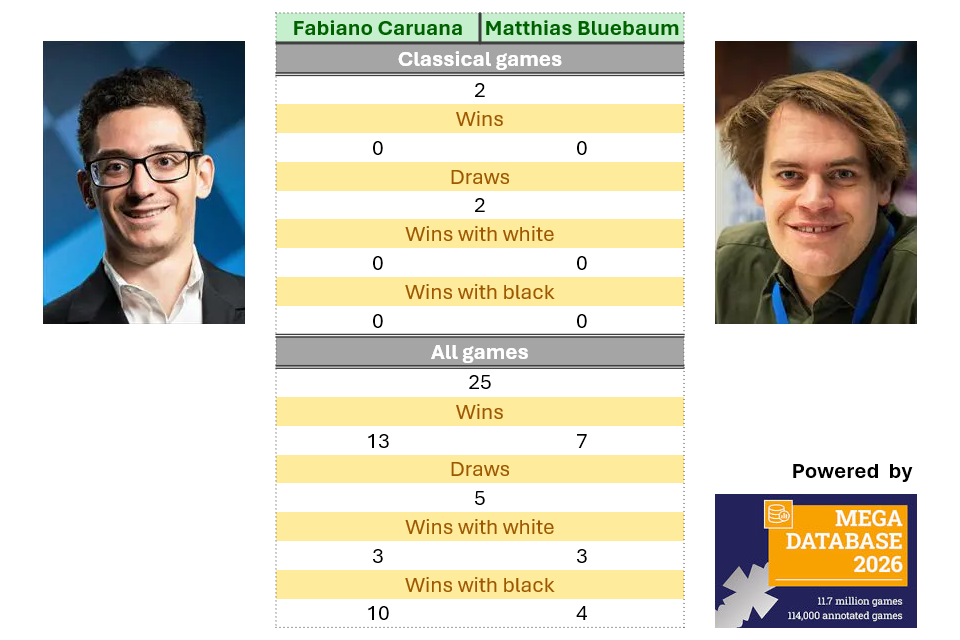 Similarly, Fabiano Caruana and Matthias Bluebaum have only played two classical games, with most of their confrontations taking place online. In their online encounters, most games have finished decisively, with Caruana holding an advantage over the German grandmaster.
