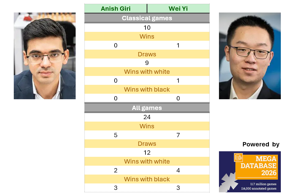 Anish Giri and Wei Yi have faced each other in ten classical games, nine of which ended drawn. Wei scored the one win in their classical games, with the white pieces at the 2016 Bilbao Masters – the game featured a Berlin Defence.