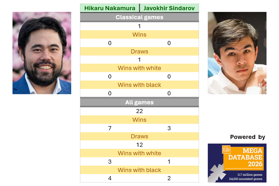 Hikaru Nakamura and Javokhir Sindarov have mostly played online except for one classical game, which ended drawn. Nakamura has an advantage over the 20-year-old in their overall record.