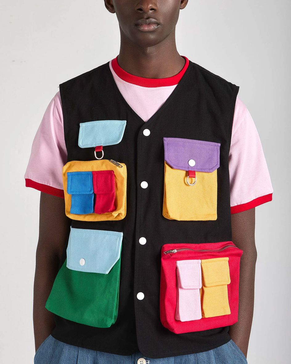 Your office, turned into fashion. David Méndez Alonso—multidisciplinary artist, fashion designer and self-declared Outsider from Galicia, Spain—has created a vest so wonderfully unhinged it deserves its own manifesto (which, appropriately, it has). Covered in colour-blocked pockets of every size and persuasion, it’s equal parts utility and absurdist theatre.