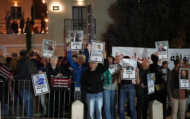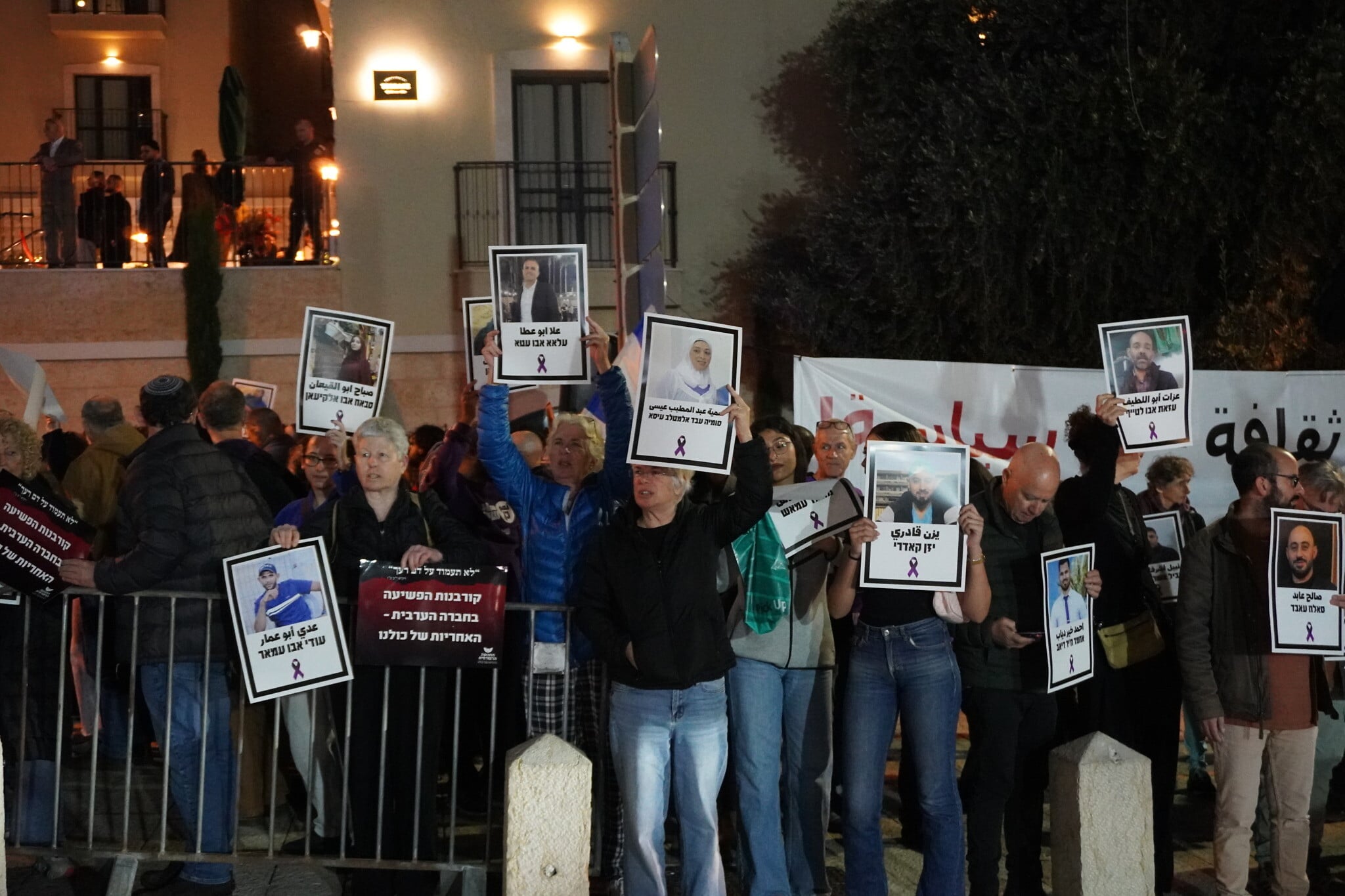 Protesters demonstrate in Haifa demanding police act against surging violent crime in Arab society on February 10, 2026. (Charlie Summers/Times of Israel)