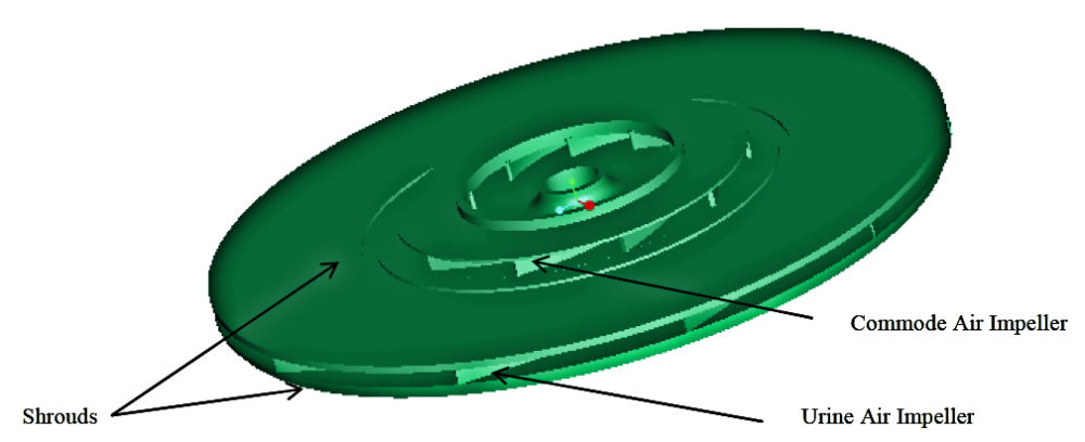 Air flow provided by a dual fan separator in the UWMS replaces gravity in the collection of liquid and solid waste, provides odor control, and removes air from the waste streams. Combining the two fan impellers used by previous space toilet designs into a single fan housing driven by one motor provides much of the resultant reduction in mass and volume. The dual-fan impeller machined into one rotor is driven by one axle and one motor and is enclosed in a 3D printed titanium housing.
