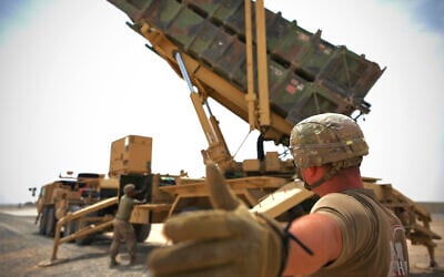 In this photo released by the US Air Force, US Army Spc. Scottlin Bartlett of the 5-52 Air Defense Artillery Battalion signals while working near a Patriot missile battery at Al-Dhafra Air Base in Abu Dhabi, United Arab Emirates, May 5, 2021. Staff Sgt. Jao’Torey Johnson/U.S. Air Force via AP)
