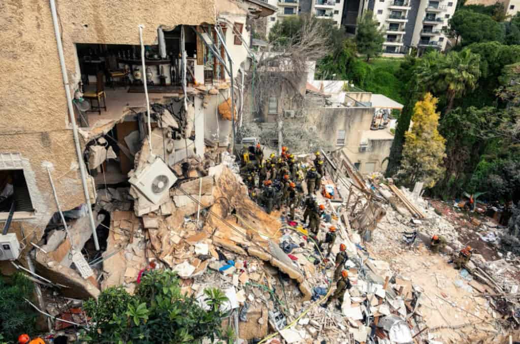 Units from Israel’s National Rescue Unit (NRU) and Home Front Command’s Search and Rescue Brigade search a building struck by an Iranian ballistic missile on April 6 in Haifa. Four people were killed in the attack. (Israel Defense Forces)