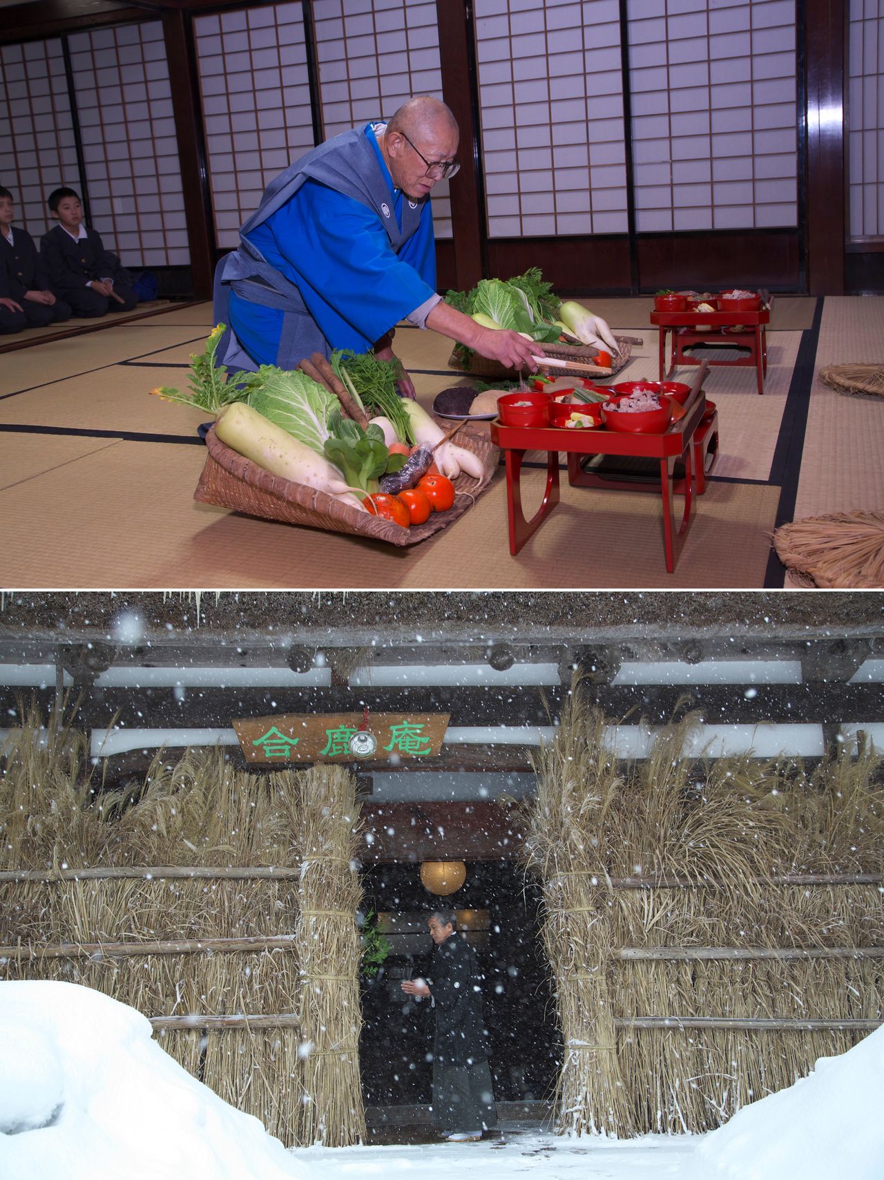 Aenokoto takes place on December 5 and February 9 at the Yanagida Botanical Park in the town of Noto. The old farmhouse on the site was damaged in the January 2024 Noto Earthquake. After a two-year hiatus, the ceremony is set to resume in 2026. (© Shimozato Kazurō/Haga Library)
