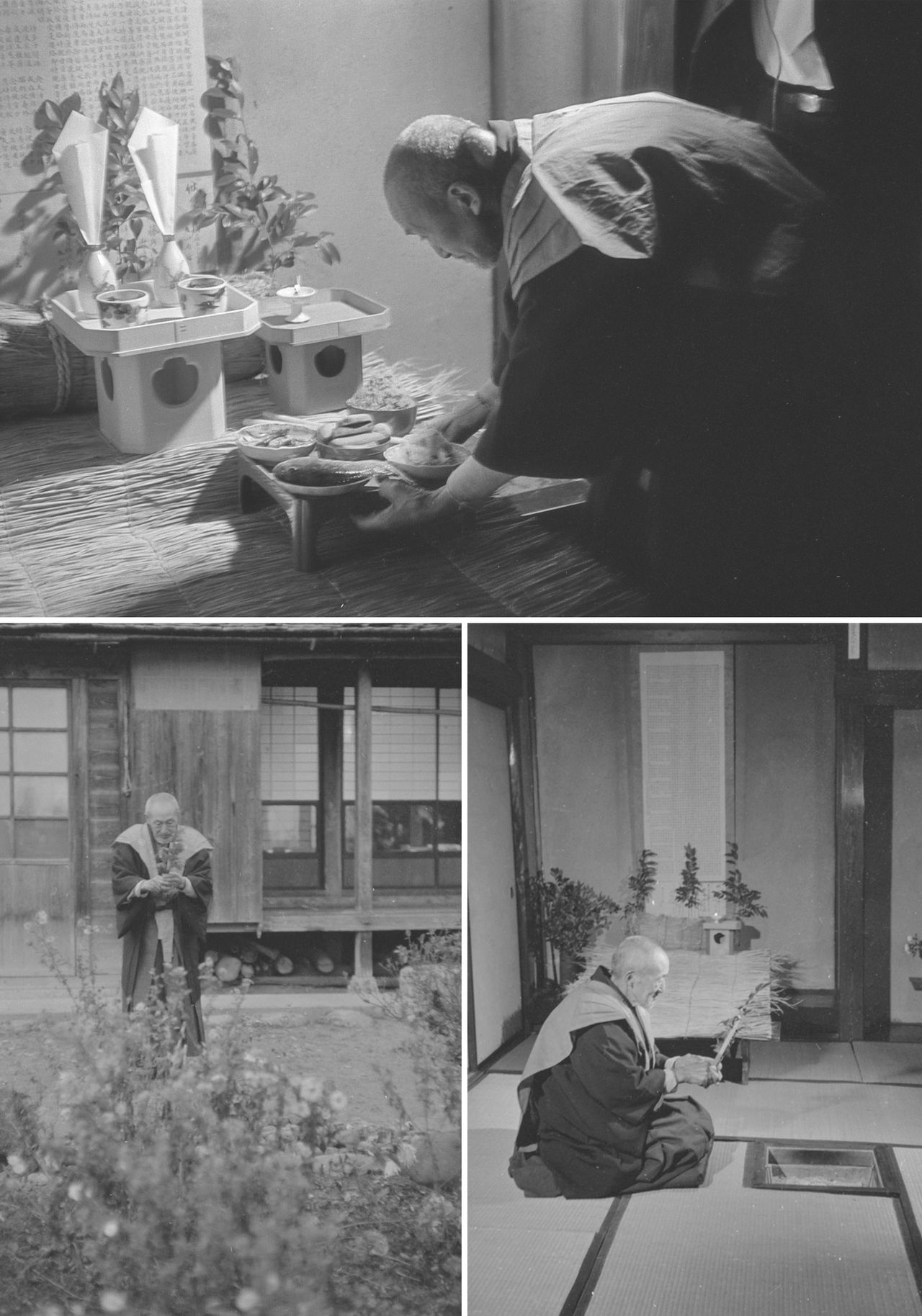 A family offers food and drink to the tanokami, represented here by bales of seed rice and a forked daikon radish. (© Haga Hideo)