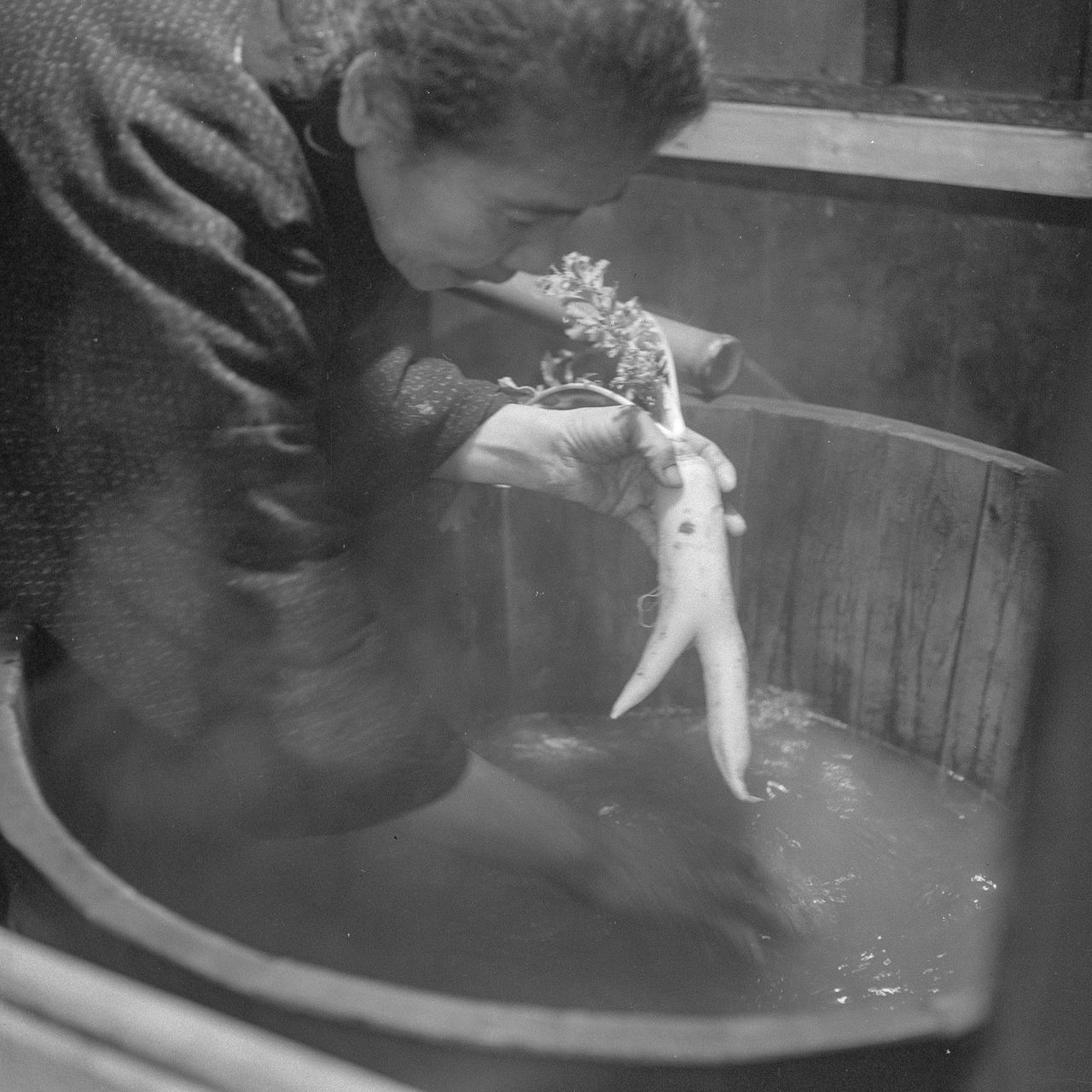 In this family, a forked daikon radish representing the divine spirit was bathed reverently. (© Haga Hideo)