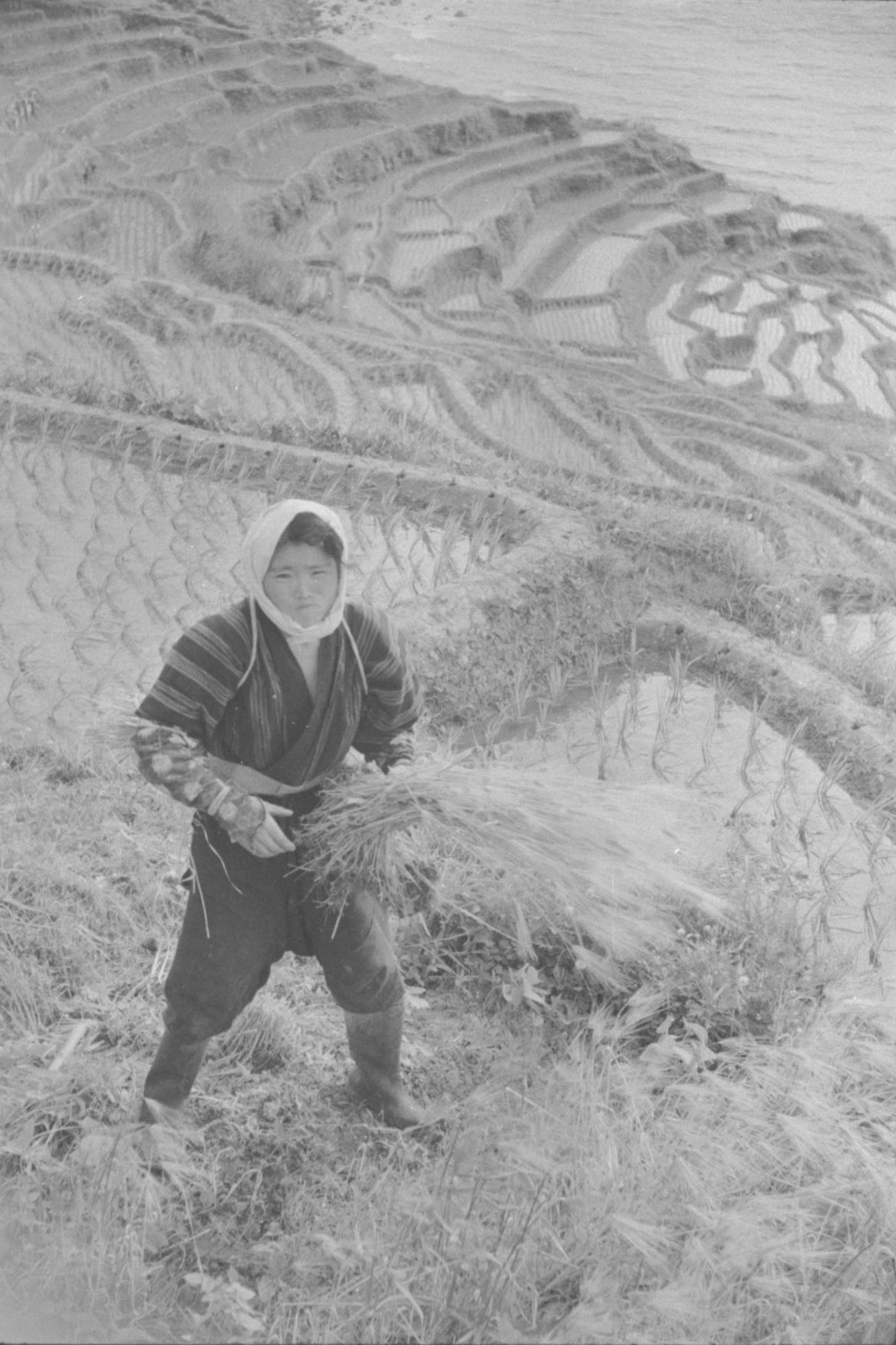 Harvesting rice at Shiroyone Senmaida, a steep hillside containing over 1,000 terraced rice paddies, in 1953. (© Haga Hideo)