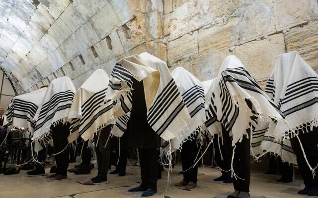 Jewish worshipers take part in the traditional Priestly Blessing during the Passover holiday in an indoor section along the Western Wall in Jerusalem, after prayers were limited to 50 participants due to the ongoing war, April 5, 2026. (Chaim Goldberg/Flash90)