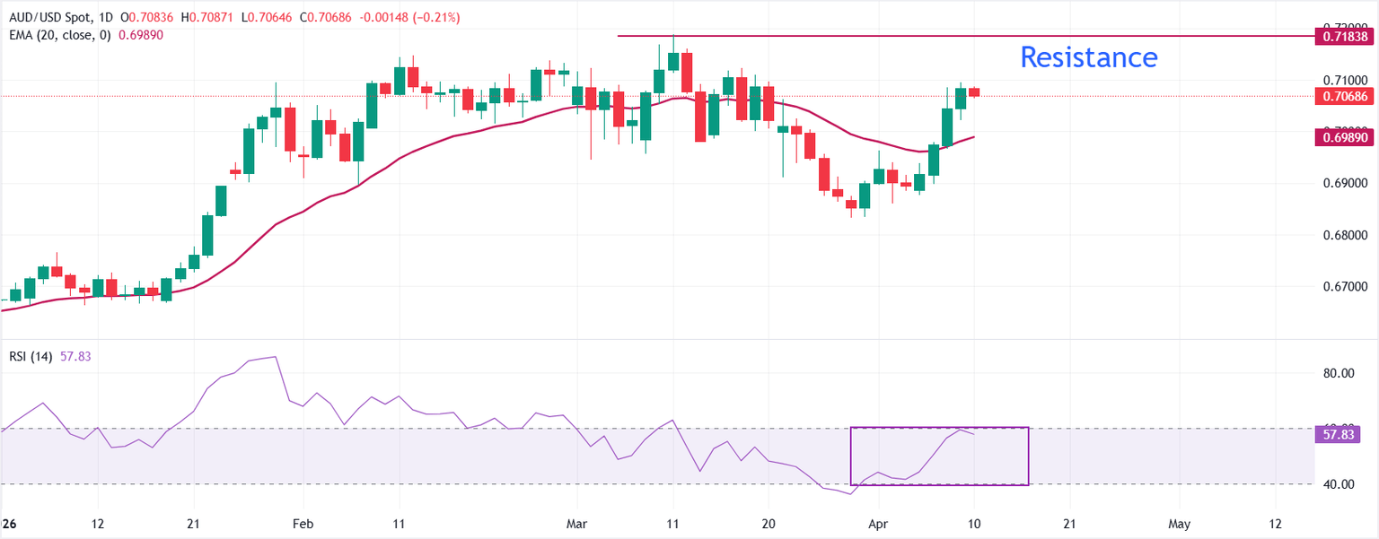Looking up, the April 9 high around 0.7100 is the immediate resistance; a decisive break above the same would allow the price to extend its rebound towards the March high at 0.7187.