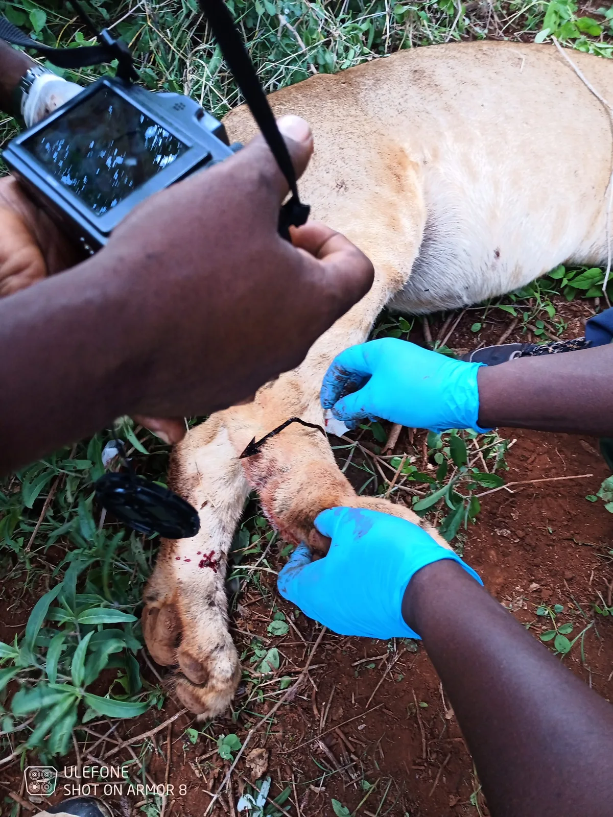 Sadly, the injury was clearly caused by a person. We knew we needed to intervene and provide medical care immediately. Whenever a wild animal is discovered with an injury, we urgently contact our colleagues from the Kenya Wildlife Service veterinary team to come and help.
