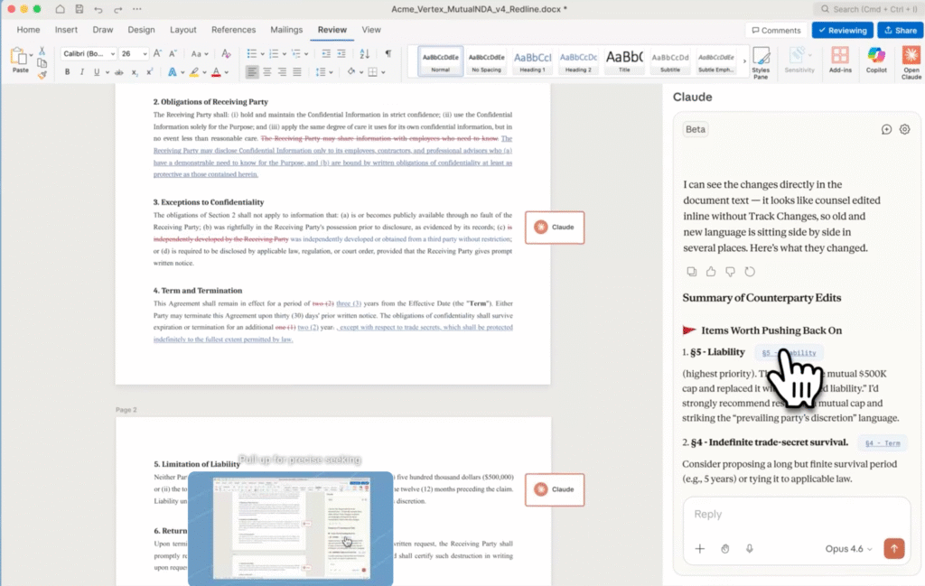 ‘Whether you’re triaging counterparty redlines, drafting from a template, or running a final consistency check, Claude maintains full transparency — every edit can land as a tracked change you review before accepting.’