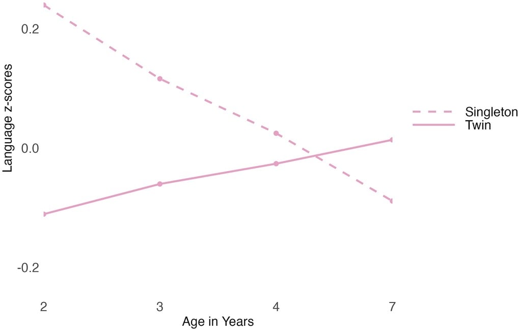 Comparison of z-scores in language between singleton children and their twin siblings. (Wood et al., Child Development, 2026)