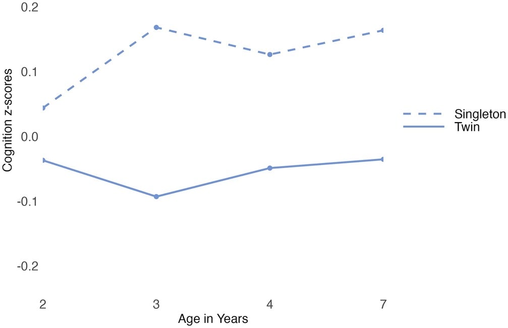 Comparison of z-scores in cognition between singleton children and their twin siblings. (Wood et al., Child Development, 2026)