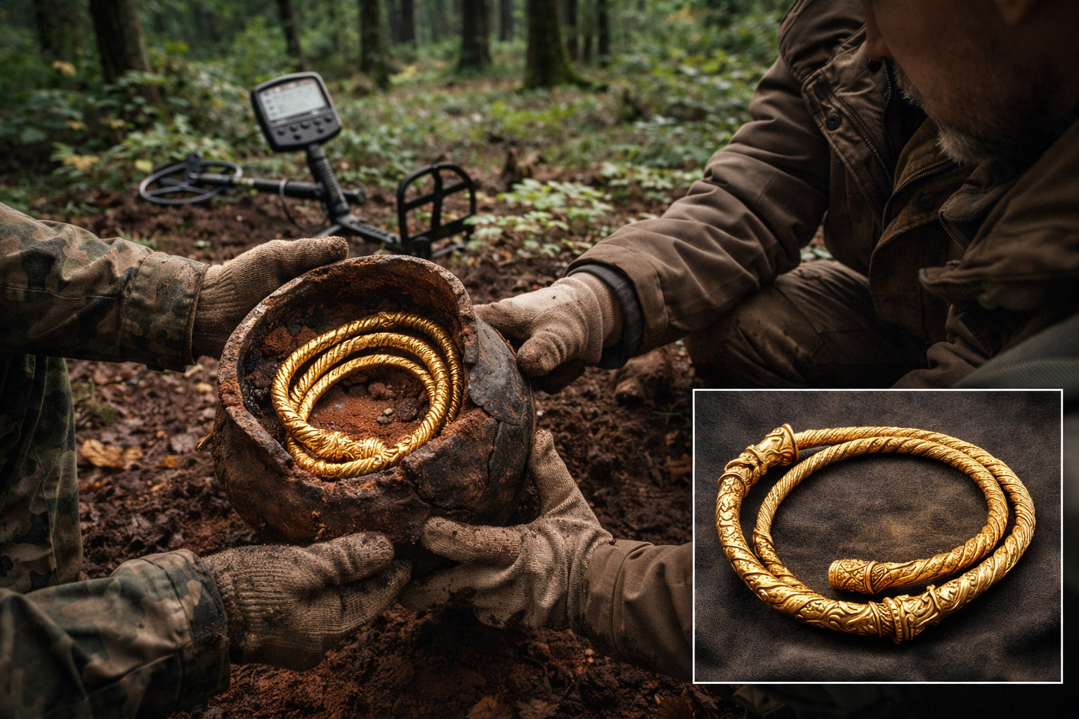 Amateur archaeologists were searching a forest in Poland with metal detectors when they found a ceramic pot buried for over 1,500 years. Inside was a pure gold necklace weighing 222 grams, folded to fit in the vessel, and when experts examined the piece, they discovered it was the first Gothic torque ever found in Polish territory.
