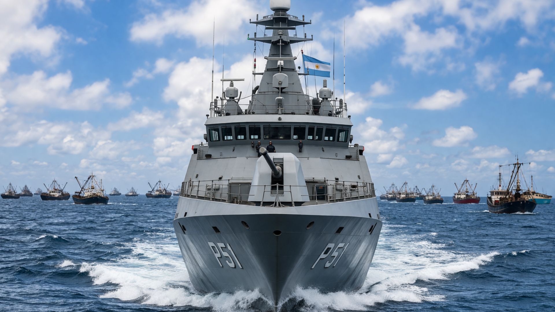 Argentina patrols the South Atlantic with ships built in France and monitors over 1.1 million km² with 87 m OPVs, a range of 7,500 miles, 360° radar, and a 30 mm cannon against illegal fishing in the 200-mile zone.