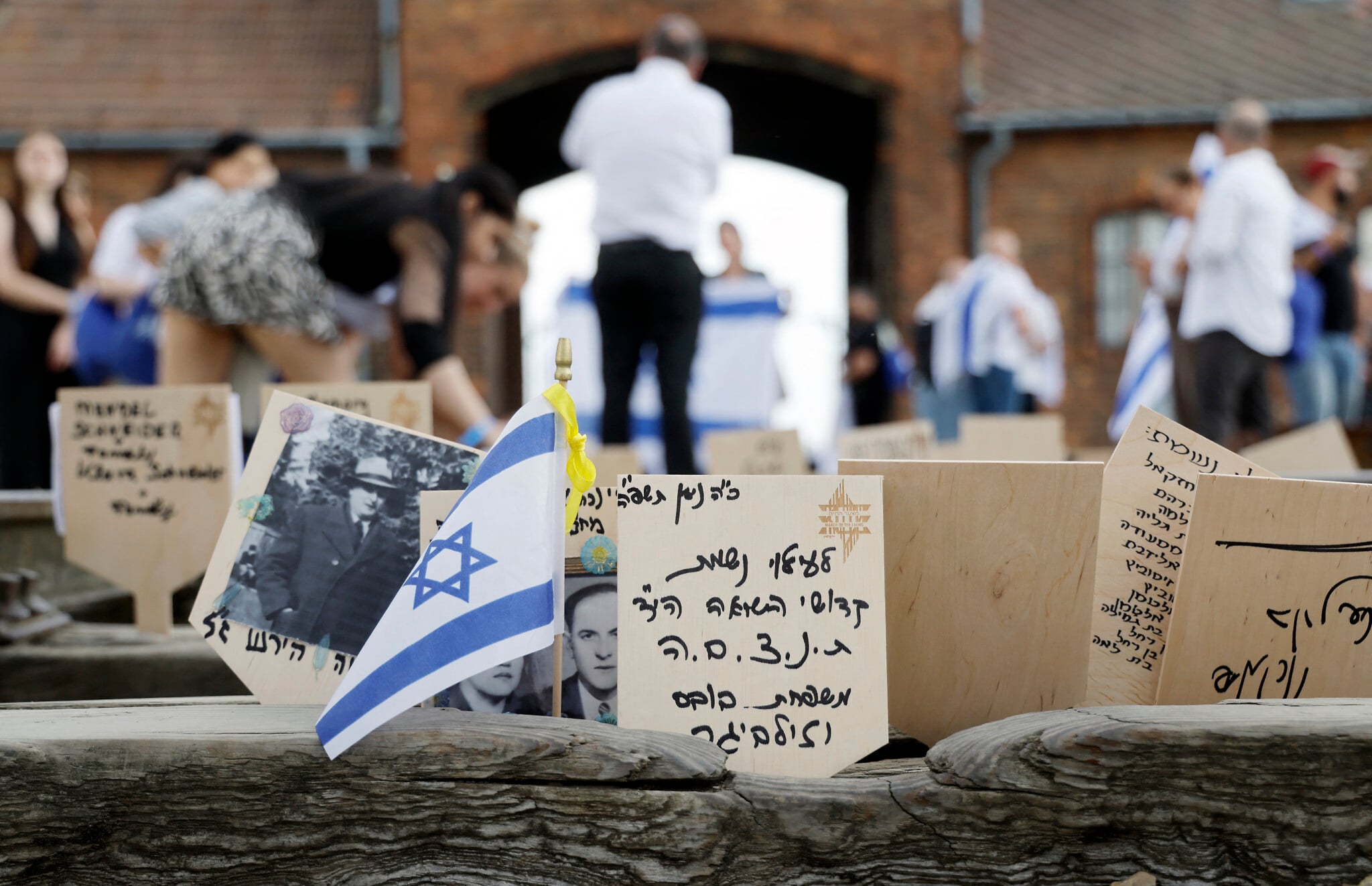 Commemorative plaques are seen on a rail track leading to the former Auschwitz-Birkenau Nazi death camp in Poland, during the annual March of The Living on April 24, 2025. (Photo by Wojtek RADWANSKI / AFP)