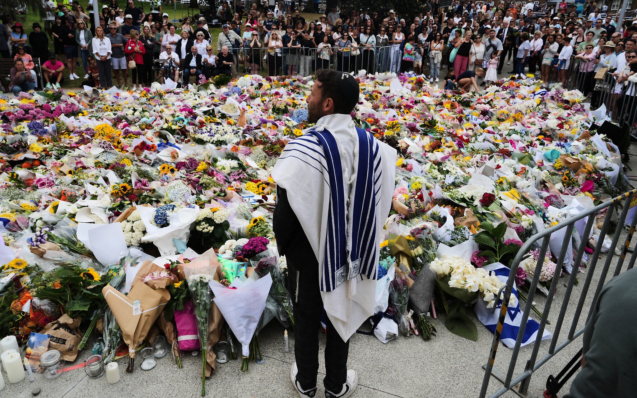 Rabbi Yossi Friedman speaks to people gathering at a flower memorial by the Bondi Pavilion at Bondi Beach on December 16, 2025, following the deadly terror shooting targeting a Hanukkah event in Sydney, Australia. (AP Photo/Mark Baker)