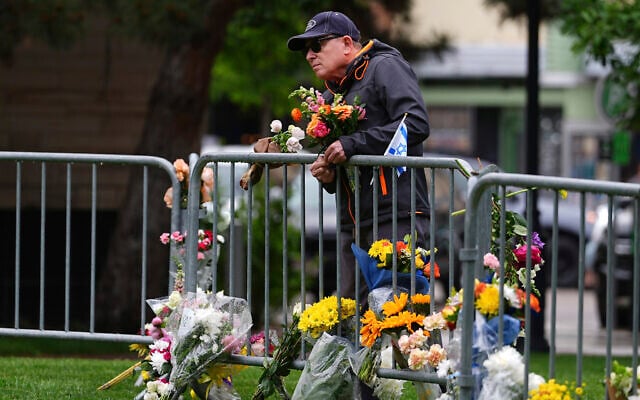 A man affixes a bouquet of flowers to a makeshift memorial for victims of an attack on a pro-Israel march outside of the Boulder County courthouse, June 3, 2025, in Boulder, Colorado. (AP Photo/David Zalubowski)