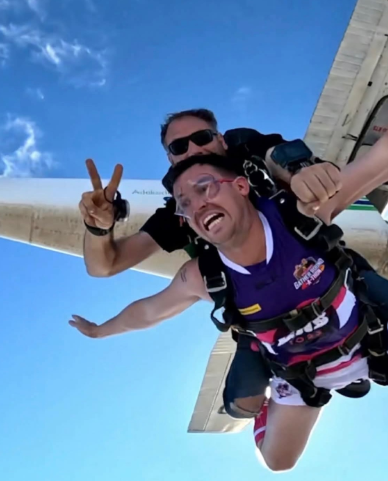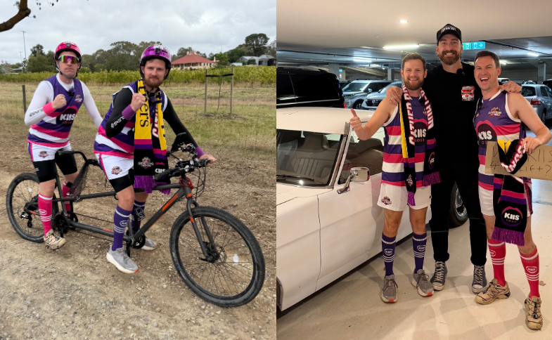 The last leg was 66 kilometres on a tandem bicycle from the Barossa to Adelaide Oval for the Port Adelaide v St Kilda game.