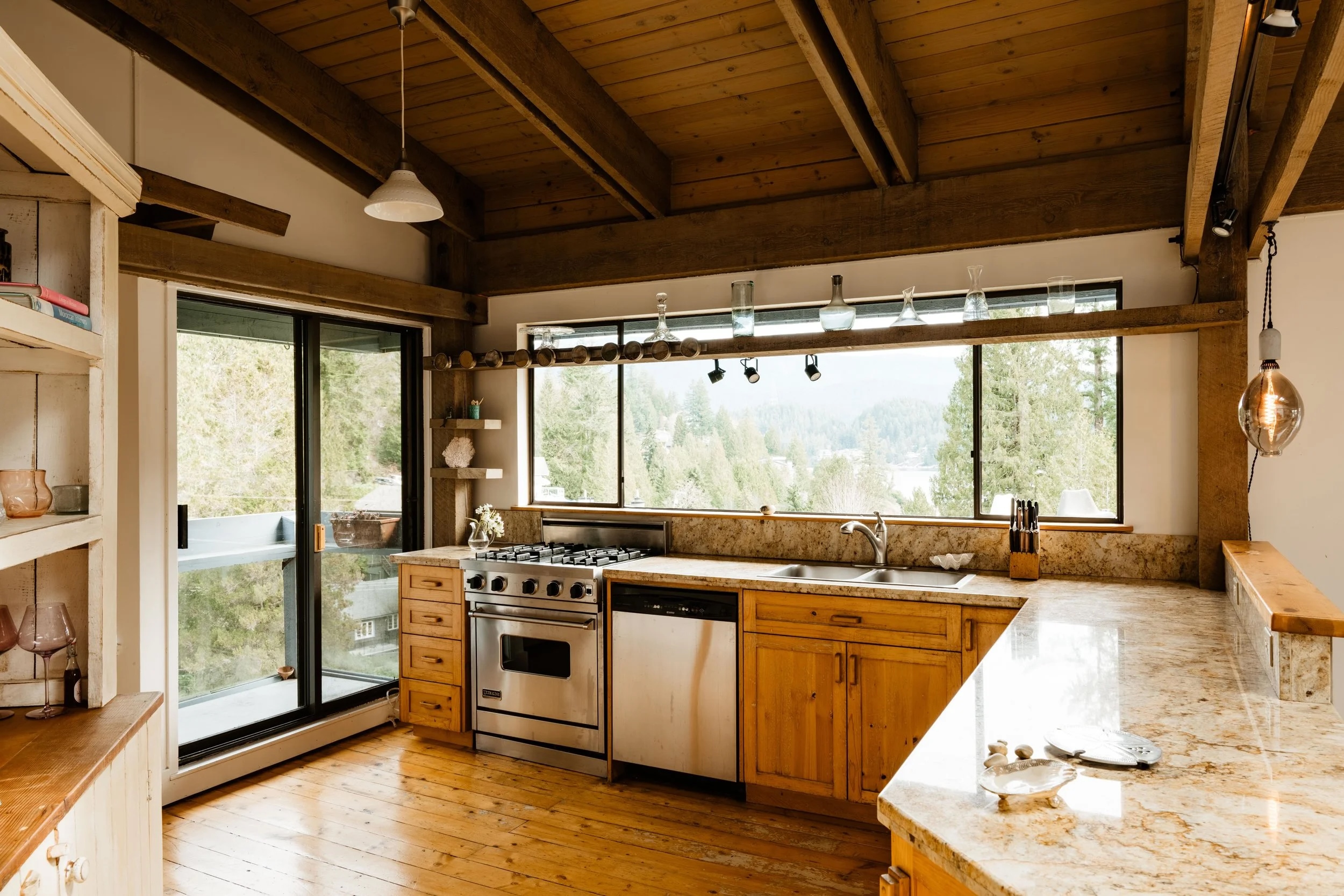 The plan is arranged across three levels. Entry occurs at the lower floor, where a foyer sits alongside a flexible room once used as a private gallery and a workshop lit from the east and west. Bedrooms occupy the middle level, positioned at opposite ends of the plan with access to outdoor decks. Above, the main living spaces sit beneath a vaulted ceiling supported by exposed post-and-beam construction. Continuous glazing wraps the perimeter, framing views of forest, rock and water, while skylights introduce shifting light through the centre of the plan.
