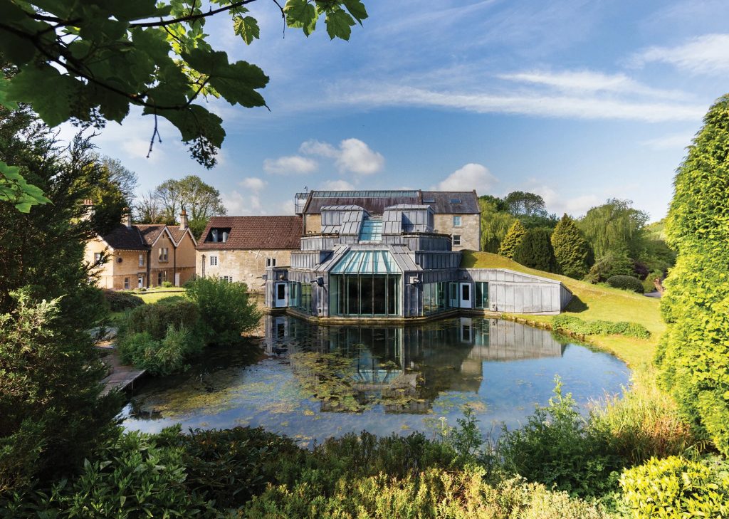 The structure is set directly into the rock, its mass organised as a series of stacked levels that follow the slope. Vertical cedar siding emphasises this upward movement, while an angled standing-seam metal roof projects outward, responding to the coastal climate.