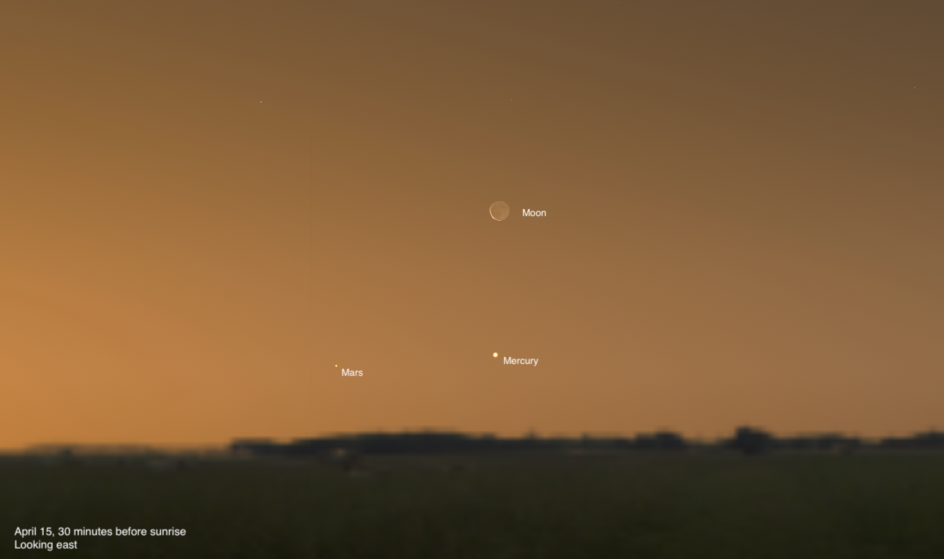 Catch bright Mercury and possibly even fainter Mars hanging below the Moon shortly before sunrise on April 15. Make sure to put away any optics well before sunrise from your location. Credit: Stellarium/USGS/Celestia/Clementine