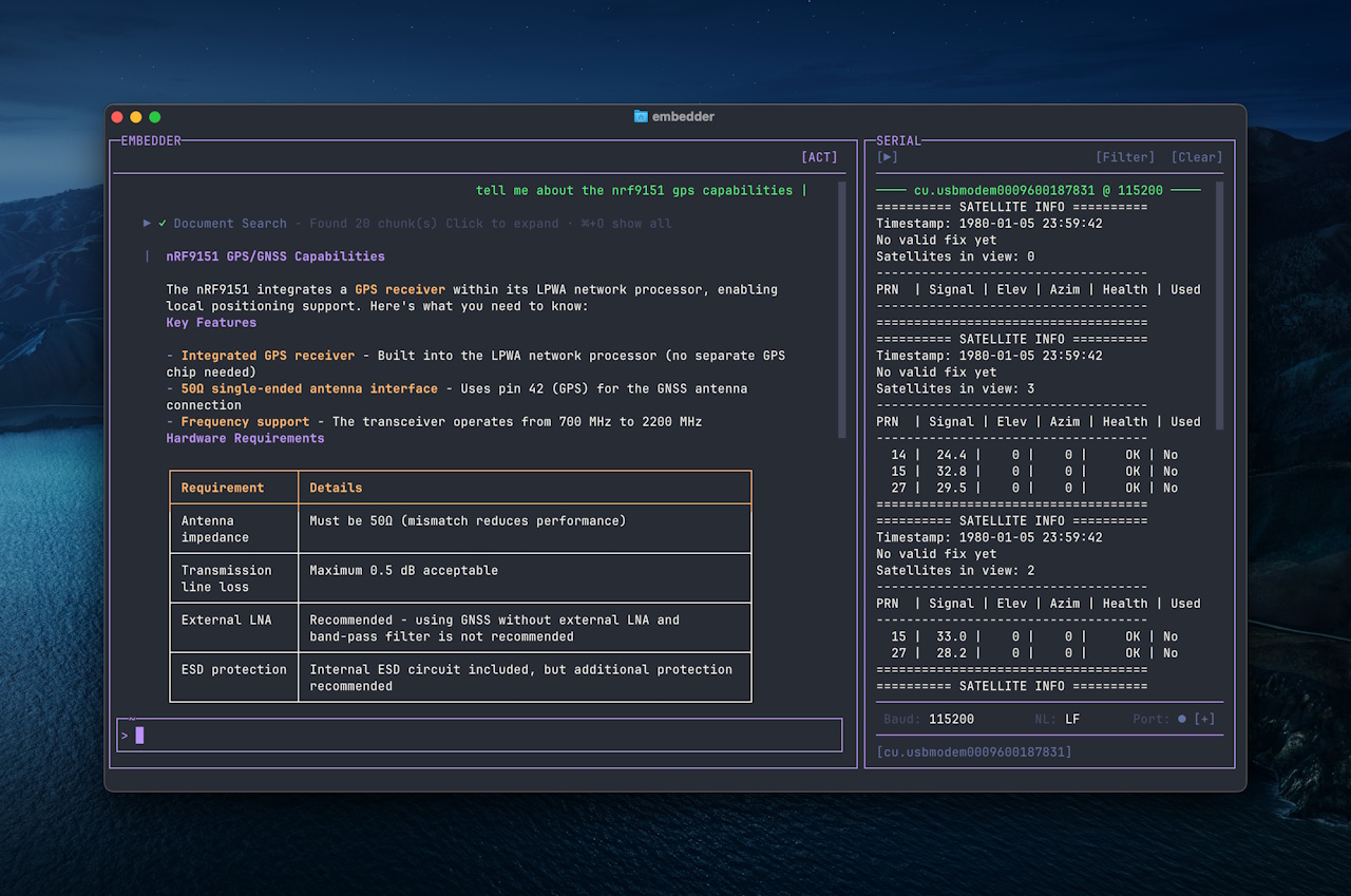 Yes, of course Embedded includes the ability to peruse and ponder data sheets and then respond to natural language queries like “Tell me about the nrf9151 gps capabilities,” as illustrated below, but this sort of thing is just the tiniest tip of the iceberg.