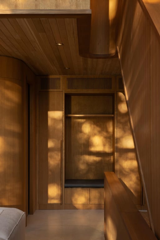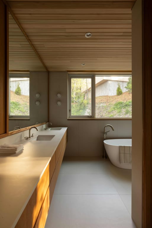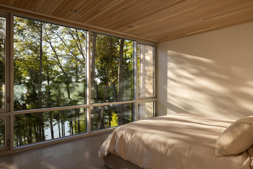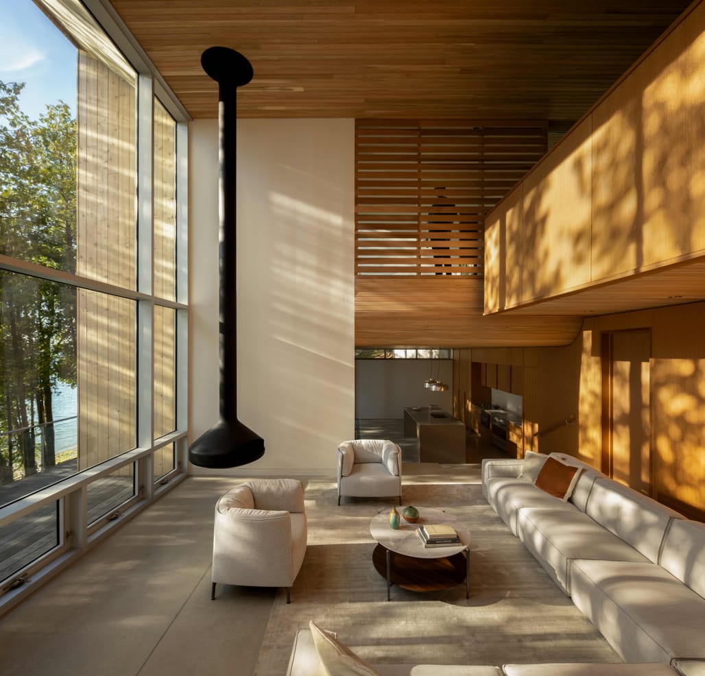 Material choices reinforce the scheme’s integration with its natural context. The exterior is clad in eastern white cedar, which continues into the interior through cedar-lined ceilings, paired with oak millwork and polished concrete floors. Inside, a restrained palette of natural materials defines the spaces, with a double-height living area featuring vertical glazing and a prominent oak staircase connecting upper levels.