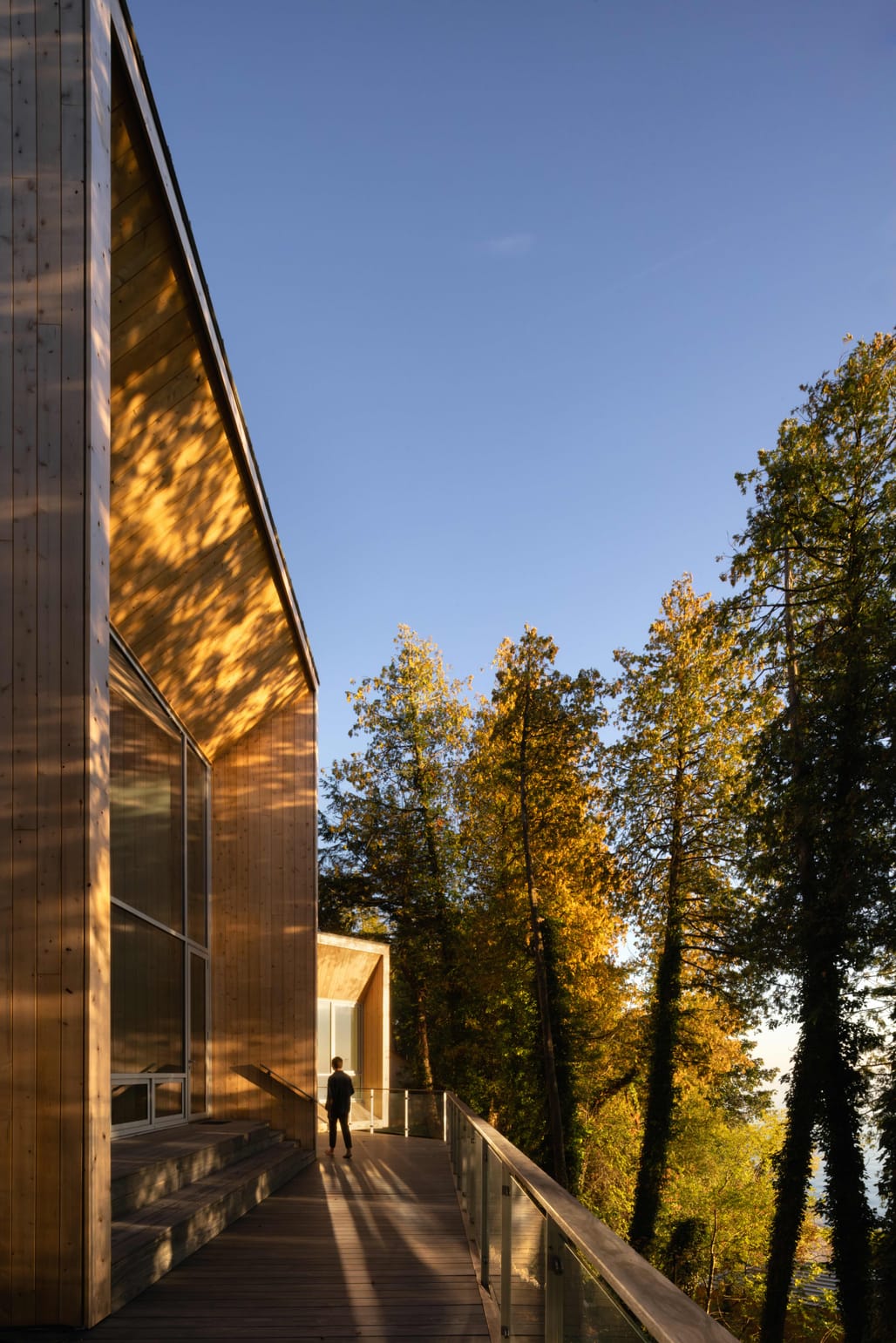 Large apertures and terraces are used to strengthen connections between interior and exterior spaces. Open terrace areas project into the tree line, while glazing captures both filtered and panoramic views, introducing varying light conditions throughout the day.