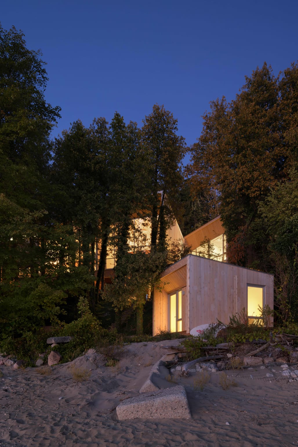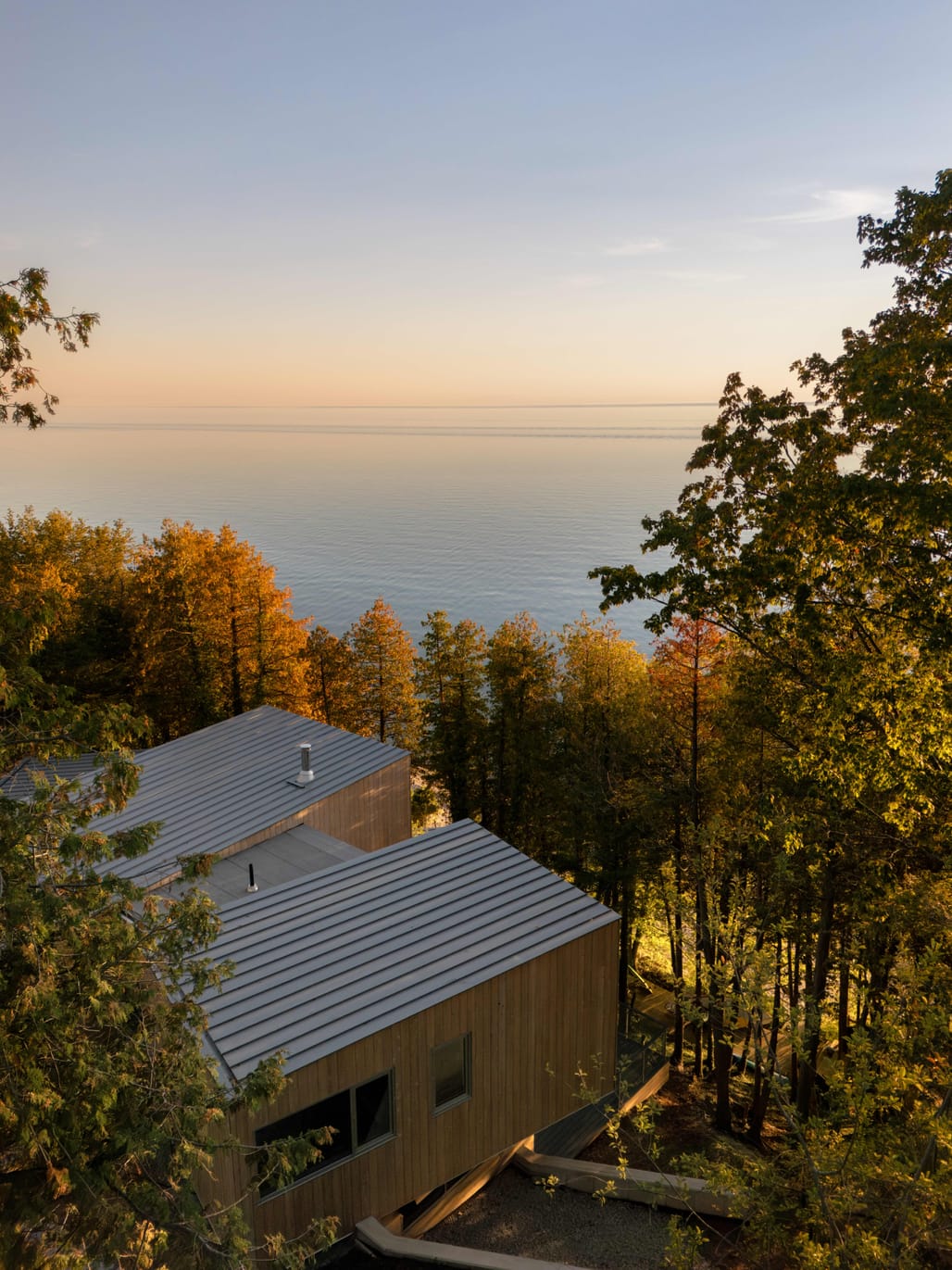 The scheme comprises a primary residence alongside smaller outbuildings, including a guest cabin and beach hut. The secondary structures adopt the same design language as the main house, extending the composition across the site. Each volume is subtly rotated to align with openings in the tree canopy, framing views of Lake Huron while maintaining the continuity of the surrounding forest.
