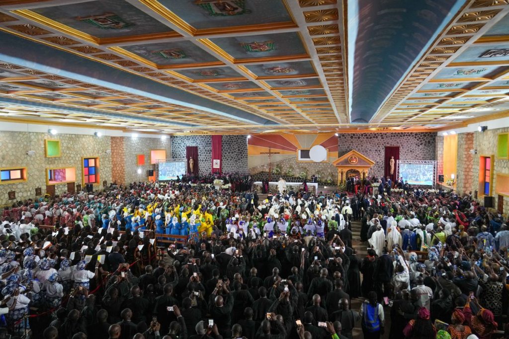 Pope Leo XIV meets with the people of Bamenda for a peace gathering at St. Joseph Cathedral in Bamenda, Cameroon, April 16, 2026. Bamenda is the largest city in Cameroon’s two Anglophone regions, which have been engaged in a nine-year insurgency seeking separation from the country’s Francophone regions. (CNS photo/Lola Gomez)