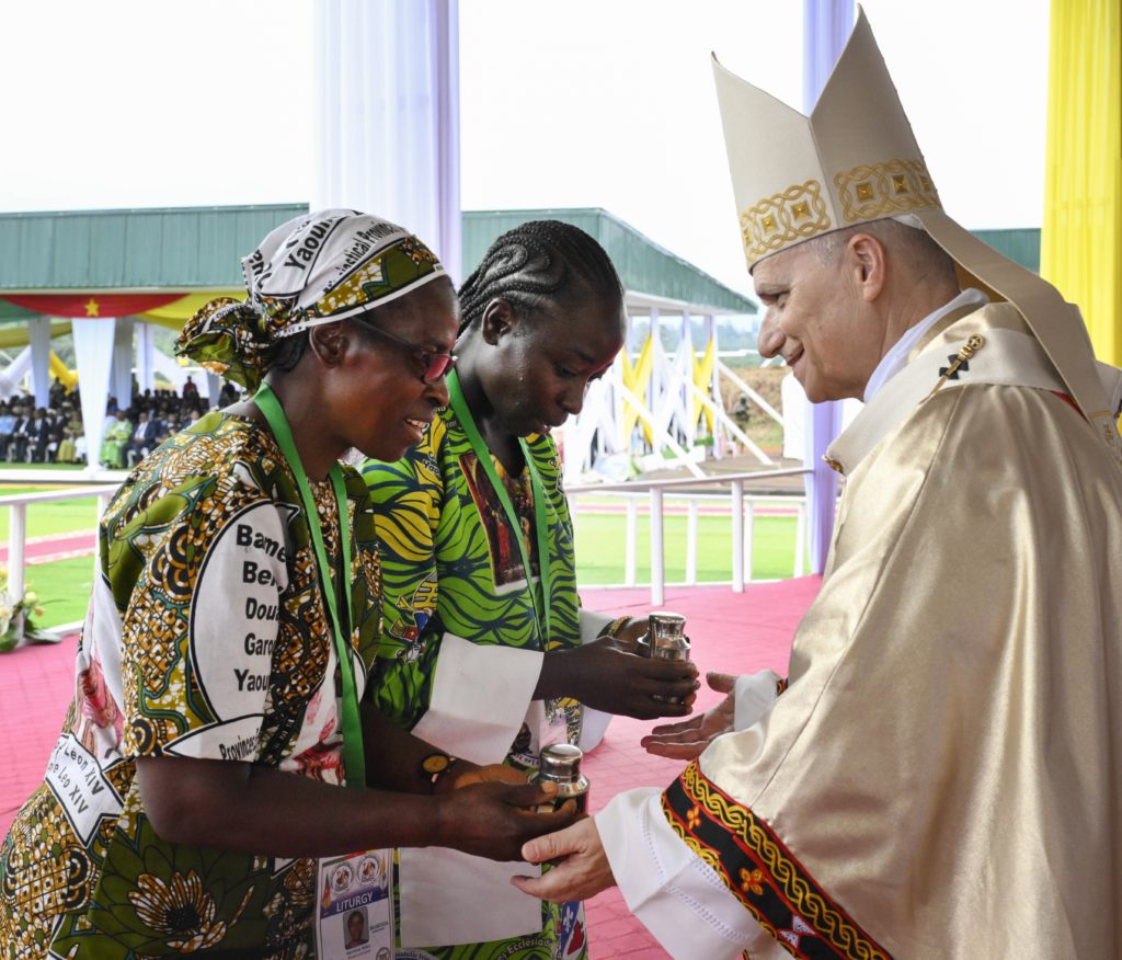 Pope Leo XIV receives the offertory gifts as he celebrates Mass at Bamenda International Airport in Cameroon April 16, 2026. (OSV News photo/Simone Risolutii, Vatican Media)