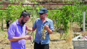 Maoz and Aziz tasting grapes from the Abu Sarah family garden in Wadi al-Joz Photo by Uri Levi