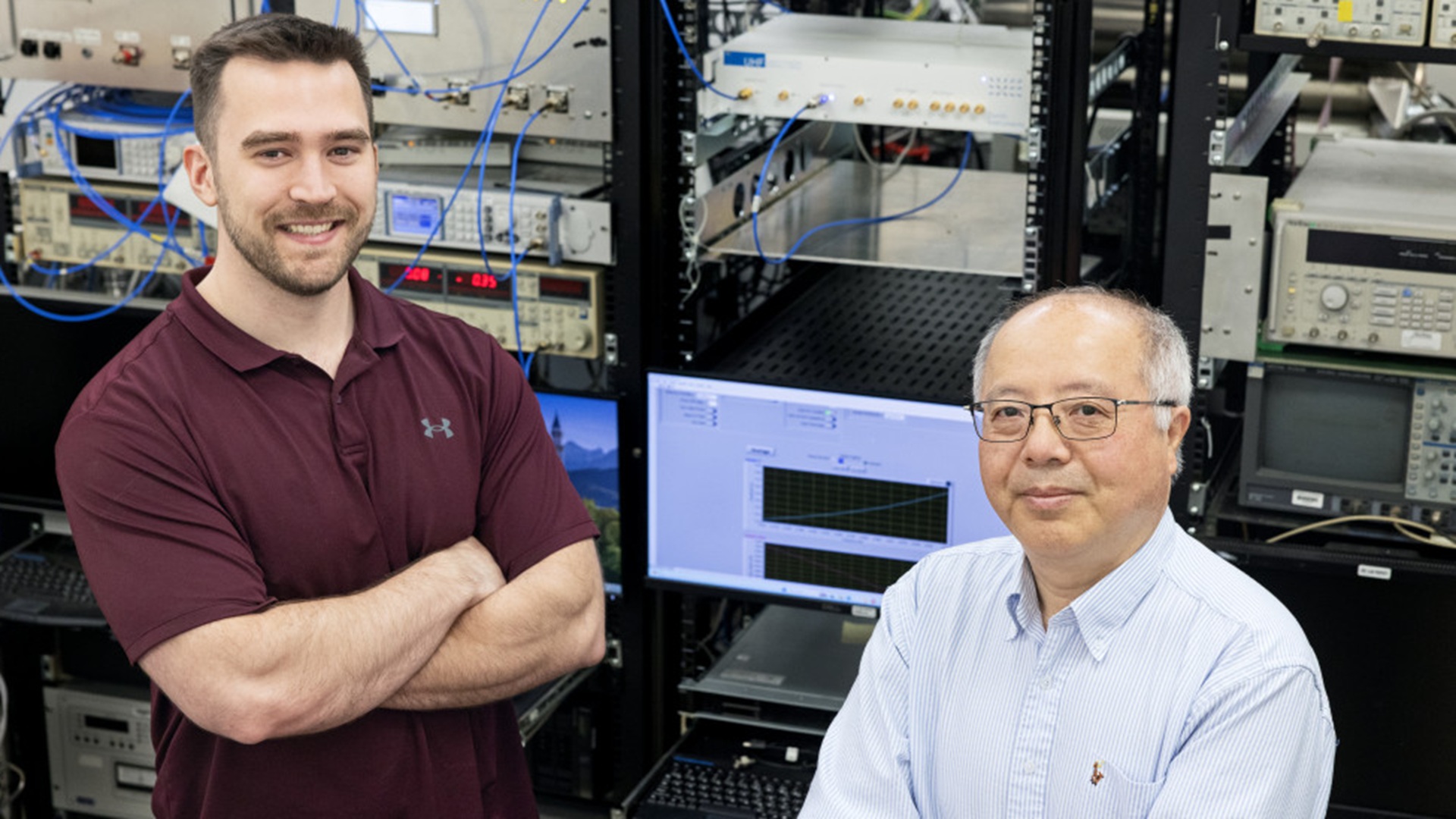 Jefferson Lab engineer Phillip Dobrenz (left) and physicist Xiangdong Wei, PhD.