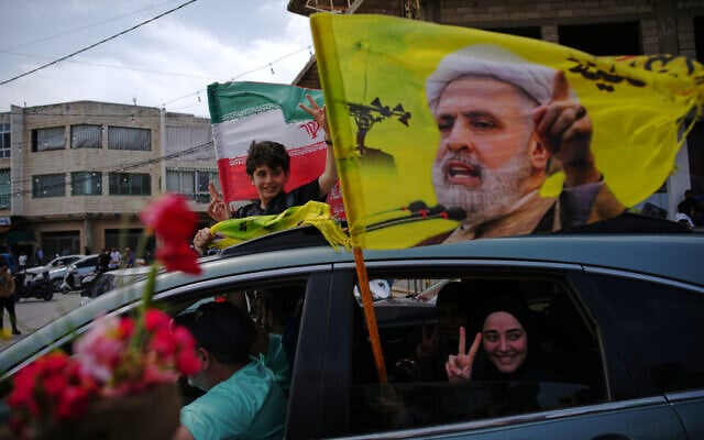 Displaced residents wave a flag with the image of Hezbollah leader Naim Qassem as they return to their villages following a ceasefire between Israel and Hezbollah, in Zefta, southern Lebanon, April 17, 2026. (AP Photo/Hassan Ammar)