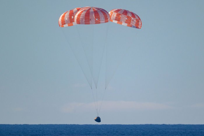 NASA’s Orion spacecraft, with the four-member Artemis II crew aboard, is seen under parachutes as it lands in the Pacific Ocean off the coast of California on Friday after its nearly 10-day journey around the Moon and back. NASA Photo by Bill Ingalls/UPI | License Photo