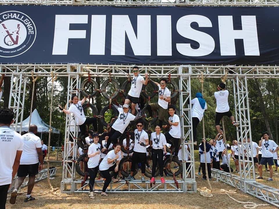 Vincent (centre) is seen with participants from Bornean Wolves Studio at the finishing line of an obstacle course racing.