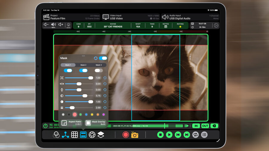 The Mask Effect has also been expanded to support three separate masks simultaneously, each with independent controls for shading, color, and line thickness. On set, this means you can overlay multiple frame line guides at once, for instance showing both a 2.39:1 theatrical crop and a 16:9 delivery format on the same feed.