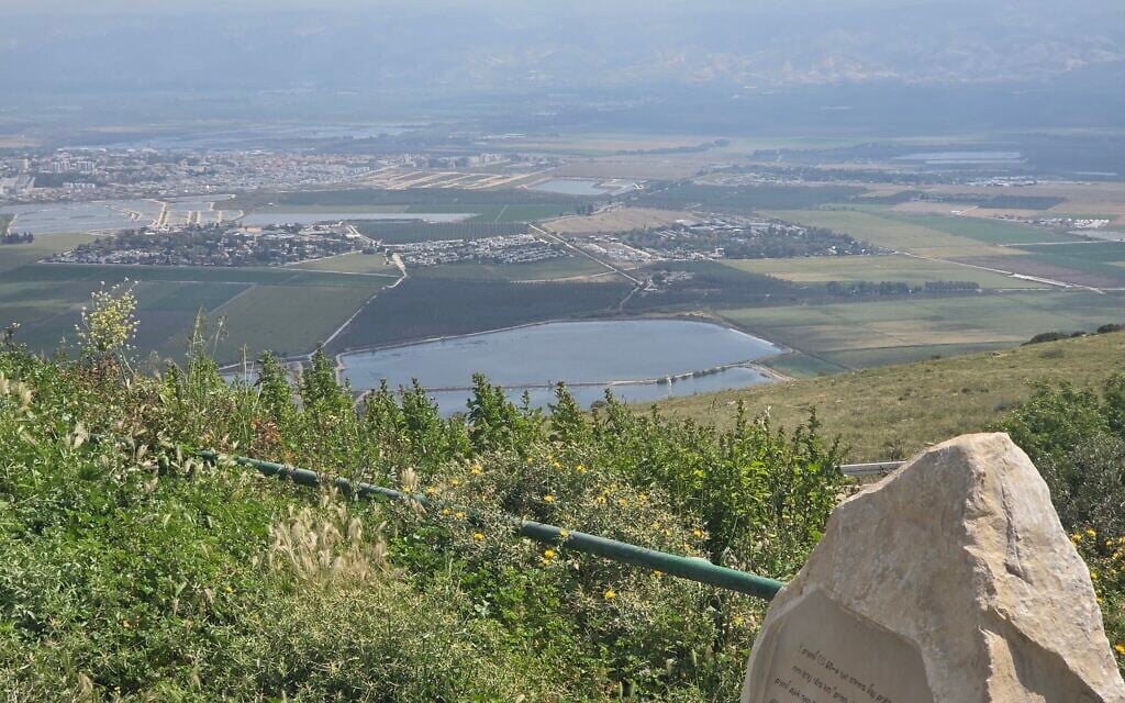View of Emek Maayanot from the top of Mount Gilboa in northern Israel, April 2026. (Aviv Lavie/The Times of Israel)