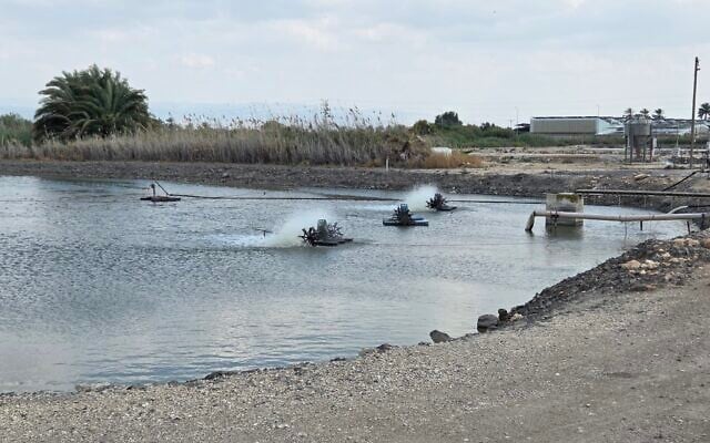 An active fishpond in Emek HaMaayanot, April 2026. (Aviv Lavie/The Times of Israel)