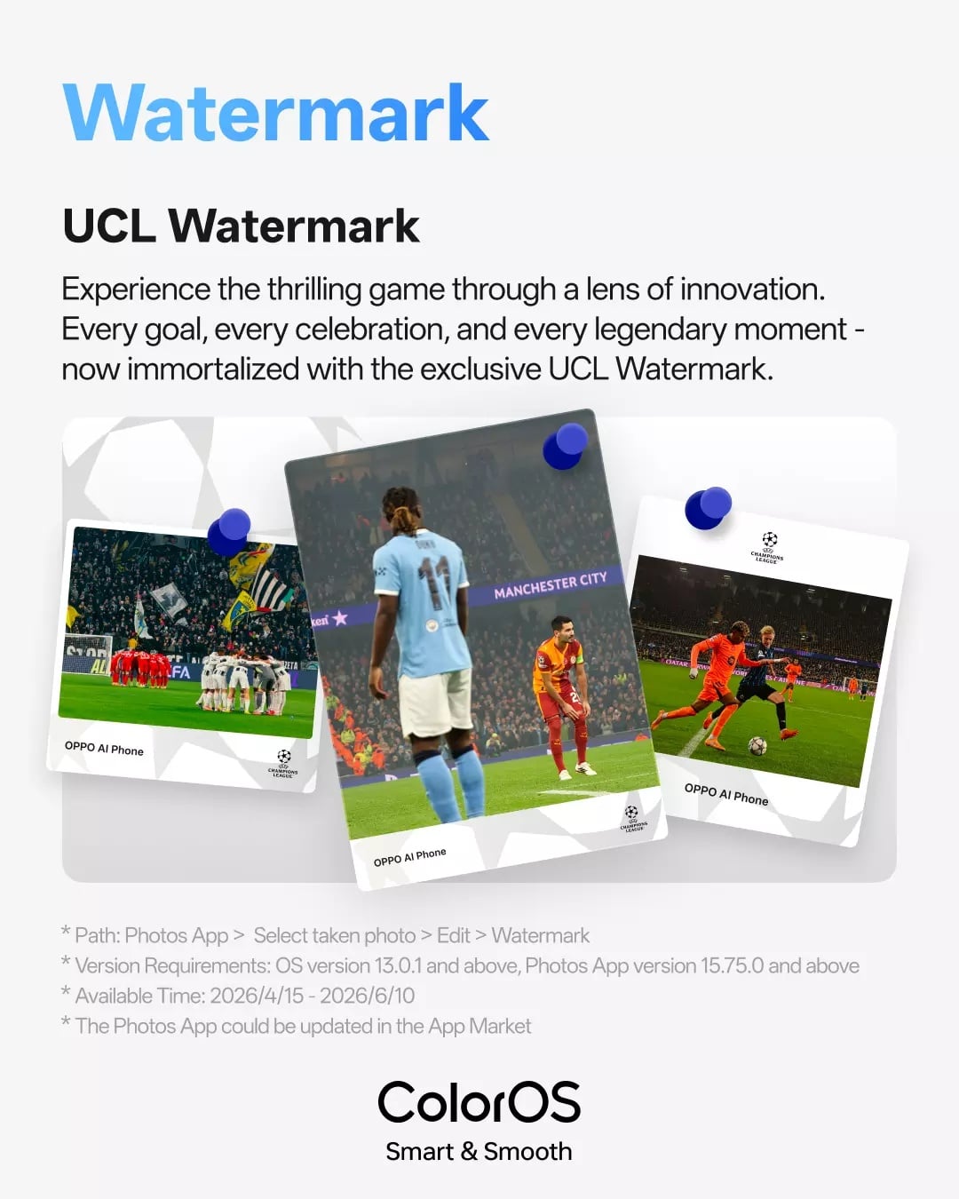 One of the visible additions in this update is a UEFA Champions League-themed watermark in the Photos app. Users can apply it by opening a photo, entering edit mode, and selecting the watermark option. The feature is available for a limited time until June 10, 2026, covering the remainder of the football season. It requires devices running ColorOS version 13.0.1 or above and Photos app version 15.75.0 or newer. Users who do not see the option may need to update the Photos app through the App Market.