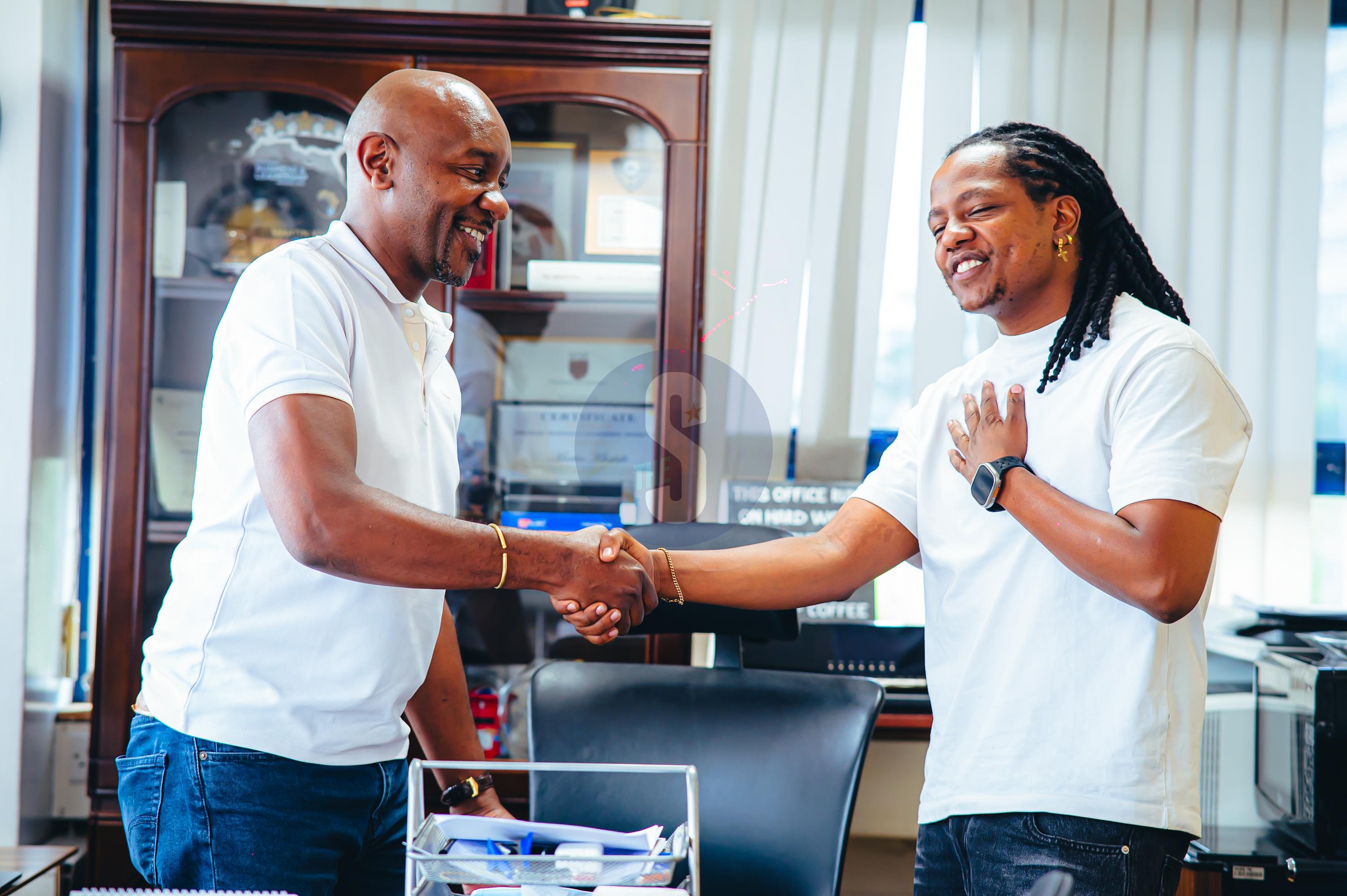 Jeremy Wahome greeting the Radio Africa Group CEO, Martin Khafafa./VICTOR IMBOTO