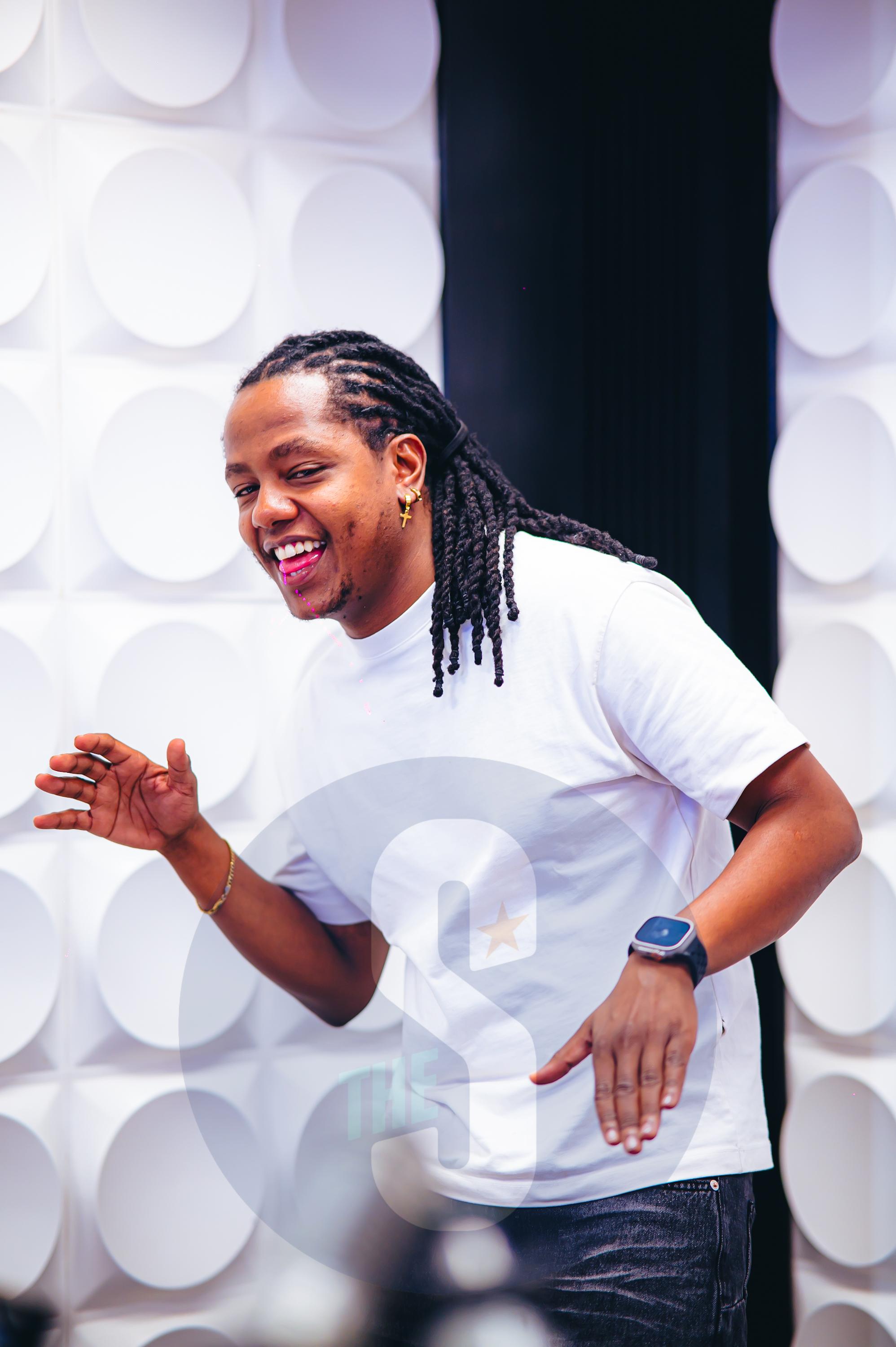 Morning Kiss presenter Jeremy Wahome having a jig in the studio. /VICTOR IMBOTO
