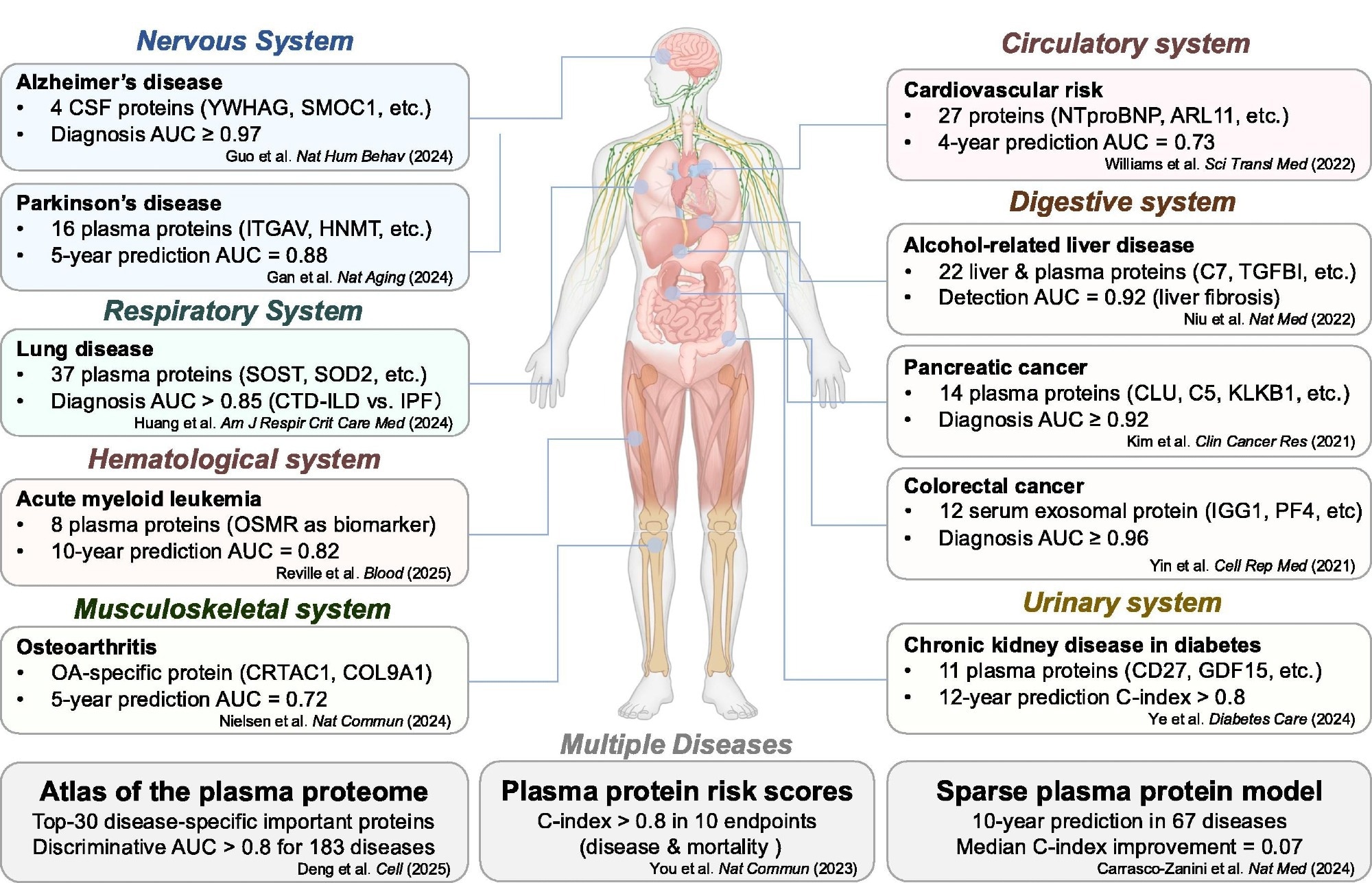 Proteomics also supports multi-disease prediction. Large-scale studies have shown that smaller panels of proteins can reliably predict multiple disease processes simultaneously, including metabolic, cardiovascular, and neurodegenerative diseases, as well as multiple chronic conditions.