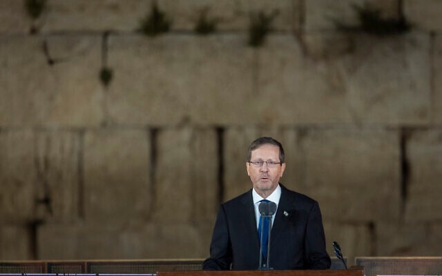 President Isaac Herzog speaks during a Memorial Day ceremony at the Western Wall, April 20, 2026. (Chaim Goldberg/Flash90)