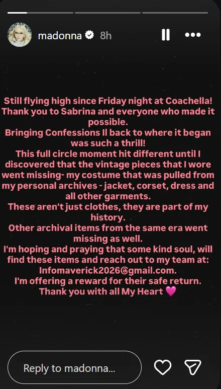 The post ended with the “Vogue” singer expressing that she is “praying” that someone will find these items. She also shared a contact number where they can reach out if they do, adding that there would be a reward for the safe return of her outfits.