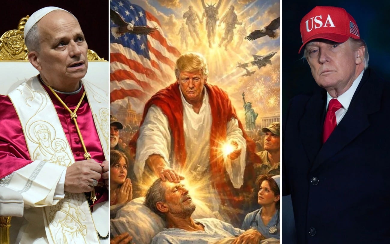 (Left to right): Pope Leo XIV leads a vigil for peace inside St. Peter’s Basilica at the Vatican, April 11, 2026 (AP Photo/Gregorio Borgia); President Donald Trump posts an AI post depicting himself as Jesus, April 12, 2026 (Truth Social); Trump waves to reporters as he walks on the South Lawn upon his arrival at the White House, April 12, 2026, in Washington (AP Photo/Jose Luis Magana)